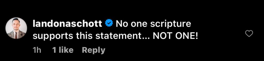 “What exactly do you propose gay people do who want to be Christian if you state on this instagram post that they cant be a Christian? I don’t really see anywhere in scripture where Christ says that sexual orientation is a barrier to the gospel. In fact, I think the book of Romans has some pretty clear things to say about nothing seperating people from the love of God. I don’t think the cross is nullified because of someone’s attractions.”